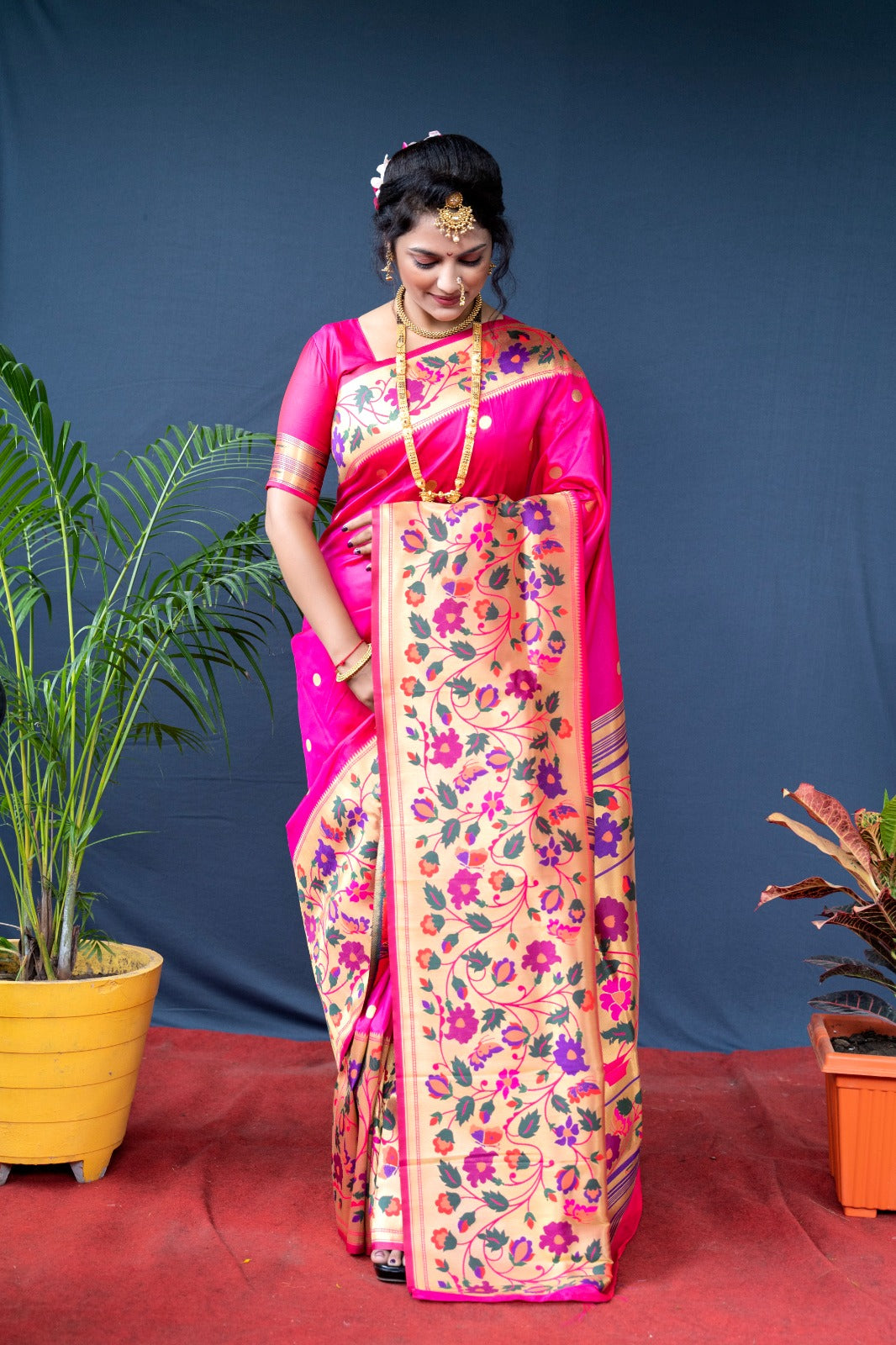 • Magenta, pink and green banarasi saree